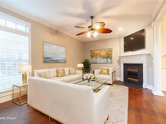 - Welcoming Living Room – A fireplace with gas logs and wood flooring add warmth and character.